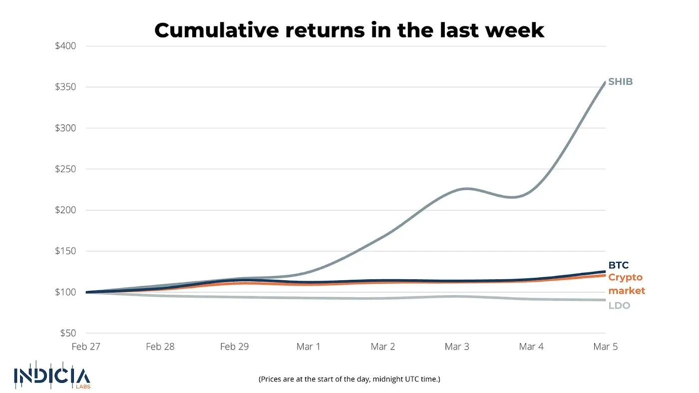 Bitcoin (BTC) gained 25% last week while the crypto market only gained 21%. The best performing coin was Shiba Inu Coin (SHIB). It more than tripled in value in the last 7 days. Sophia had been bullish on SHIB repeatedly in the past, driven by what we perceived to be very strong sentiment. The worst performing coin of the week was Lido DAO (LDO). It lost 9.4% amidst controversy about a new staking proposal.