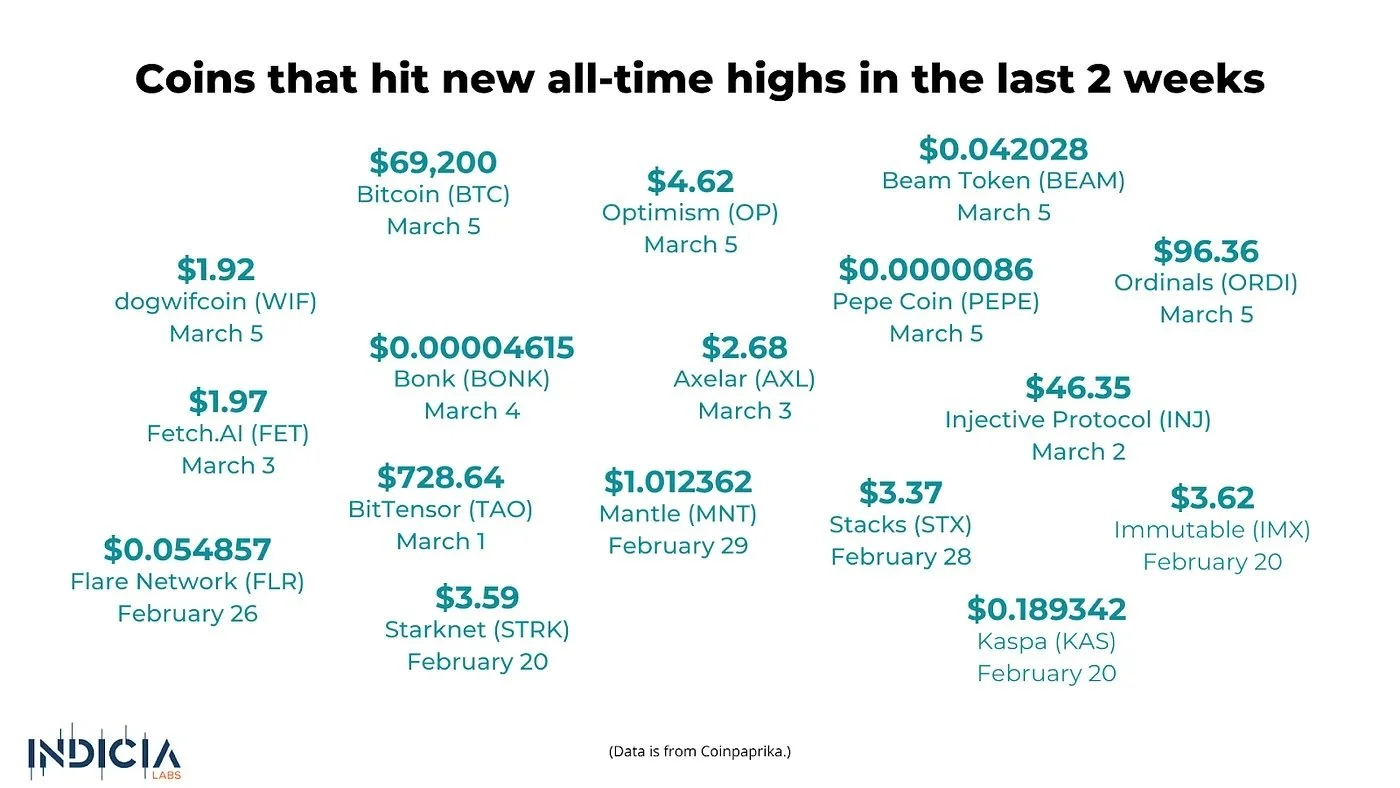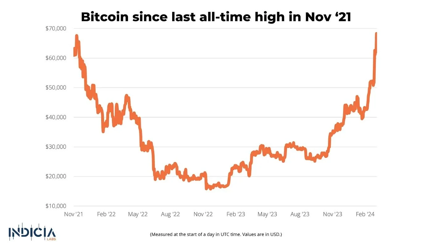 Last week, we wrote that Bitcoin was only USD 12,000 away from its all-time high. That’s no longer true this week. Bitcoin (BTC) has broken its all-time high against the US Dollar. On Tuesday, March 5, Bitcoin traded above USD 69,200, establishing a new USD all-time price record.