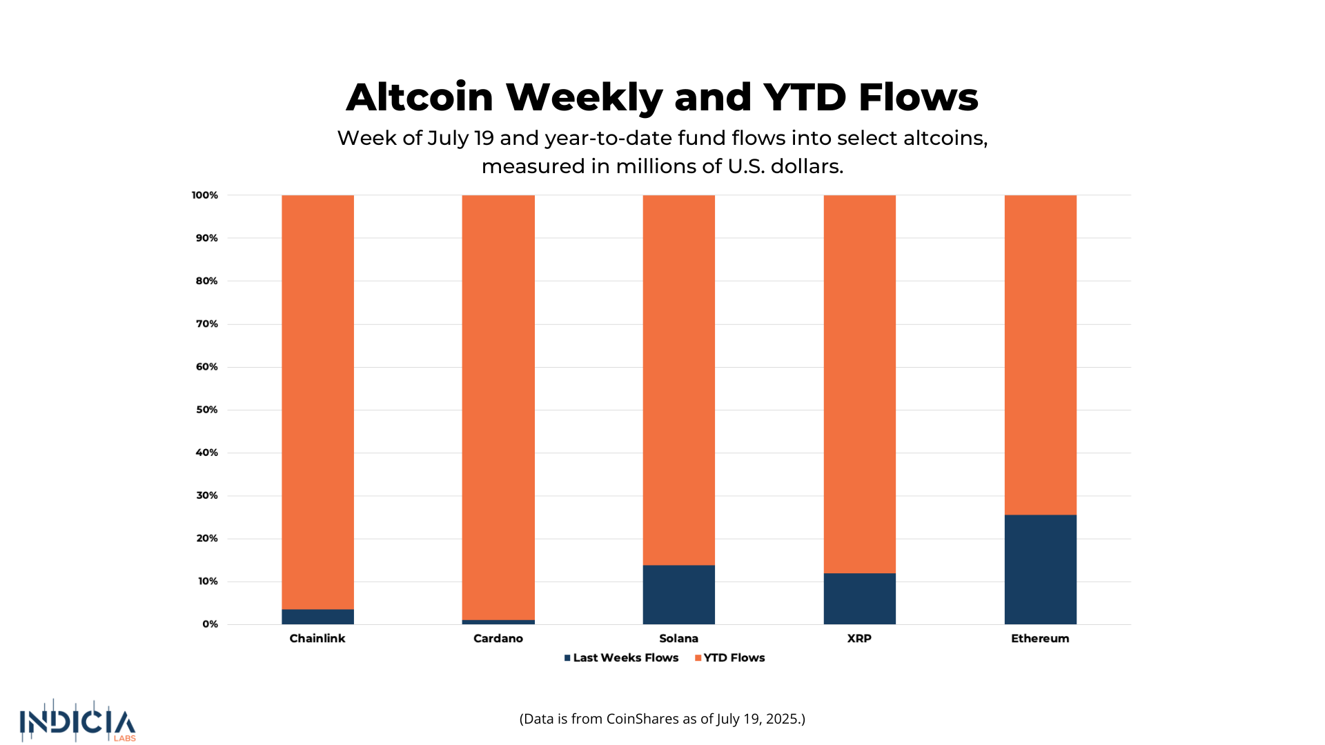 The move into altcoins is being driven by an array of developments. The GENIUS Act, passed in July, has established a regulatory framework for stablecoin issuance in the U.S., giving both banks and fintechs a path to participate. This legislation strengthens the investment case for Layer-1 blockchains like Ethereum, Solana, and XRP, networks that serve as the foundation for tokenized financial infrastructure.