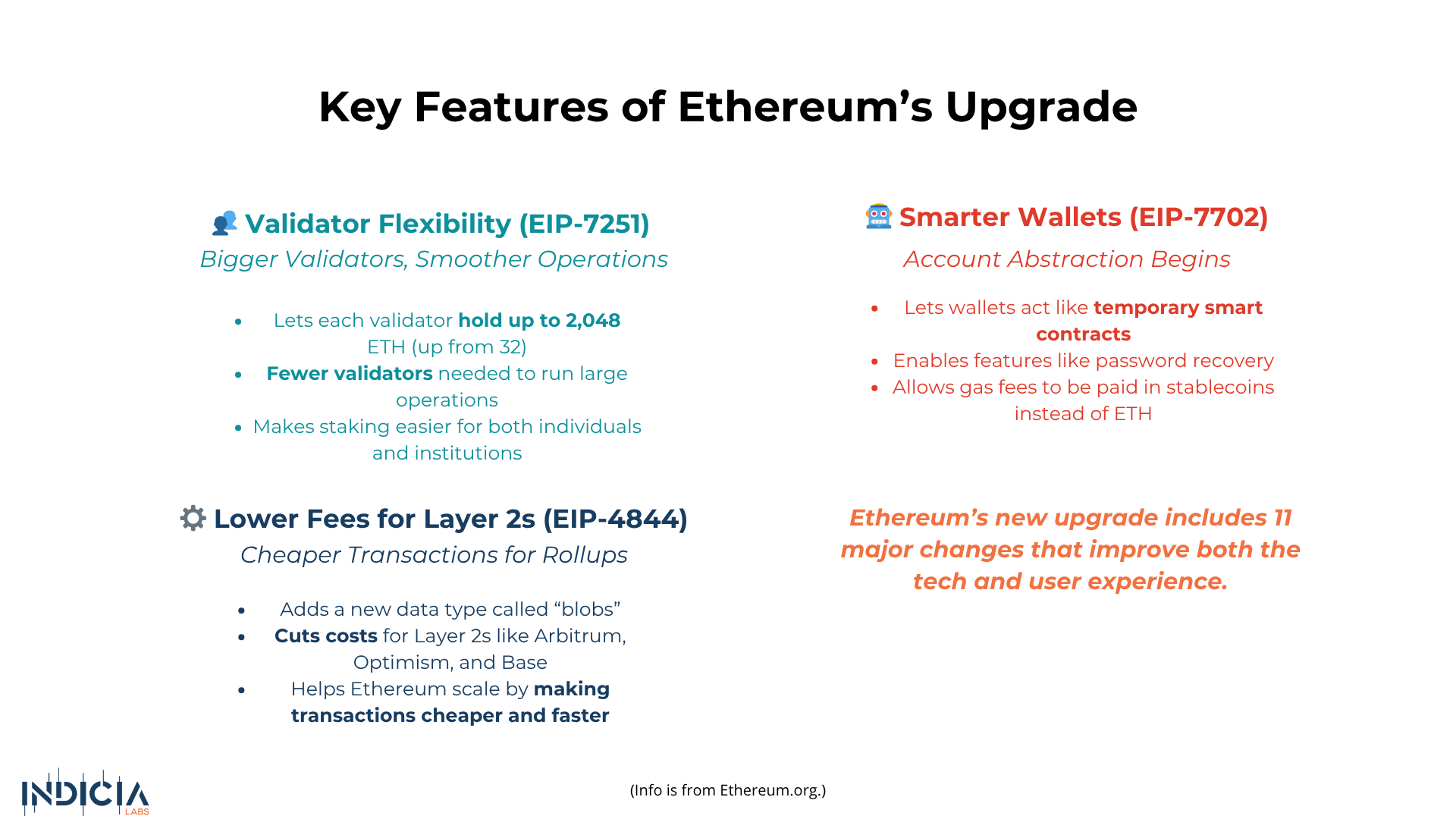 The upgrade includes 11 changes aimed at making Ethereum faster, cheaper, and easier to use. One of the biggest updates, EIP-7251, increases the limit on how much ETH each validator can hold—from 32 to 2,048 ETH. This makes it easier for both individuals and large operators to manage their staking more efficiently. Another major change, EIP-7702, was co-authored by Ethereum founder Vitalik Buterin. It gives wallets more flexibility by letting them act like smart contracts for a short time. This unlocks useful features like password recovery and the option to pay gas fees with stablecoins instead of ETH. Finally, EIP-7691 helps Ethereum handle twice as much data from Layer 2 networks like Arbitrum and Optimism, which means faster and cheaper transactions for users.